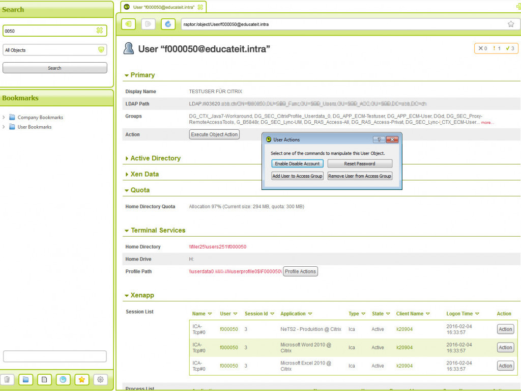 Alle Informationen zu einem Computer oder Benutzer werden im Raptor Client auf einer einzelnen Seite übersichtlich dargestellt. Dabei werden diese aus unterschiedlichen Systemen wie Active Directory, Citrix und weiteren Quellen in Abschnitten angeordnet und wo notwendig zusammengefasst.