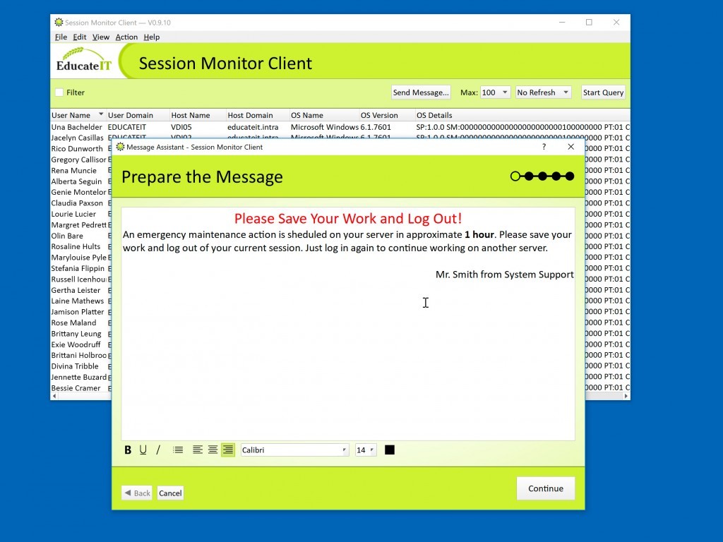Der Session Monitor weiss in Echzeit immer, welcher Benutzer wo angemeldet ist und ob dieser den Client aktuell verwendet. Administratoren können unkompliziert Nachrichten an die Sessions verschicken. Entweder Zeitbasierend oder interaktiv, mit der Möglichkeit Feedback des Benutzers abzufragen.